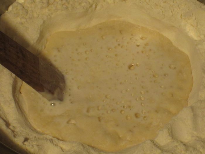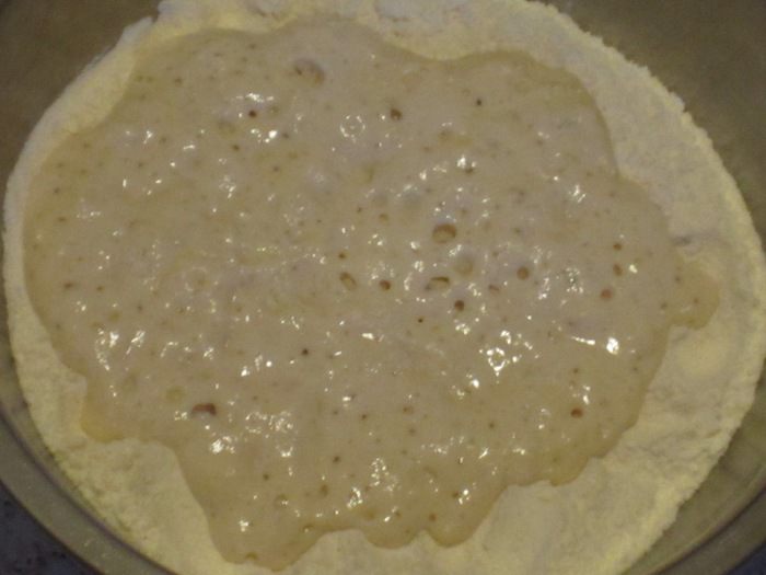 Высыпать муку в миску и сделать углубление в центре, влить дрожжи и слегка перемешать с небольшим количеством муки. Оставить опару в таком виде, не перемешивая с оставшейся мукой. Накрыть пищевой плёнкой и поставить на 30 минут в тёплое место.