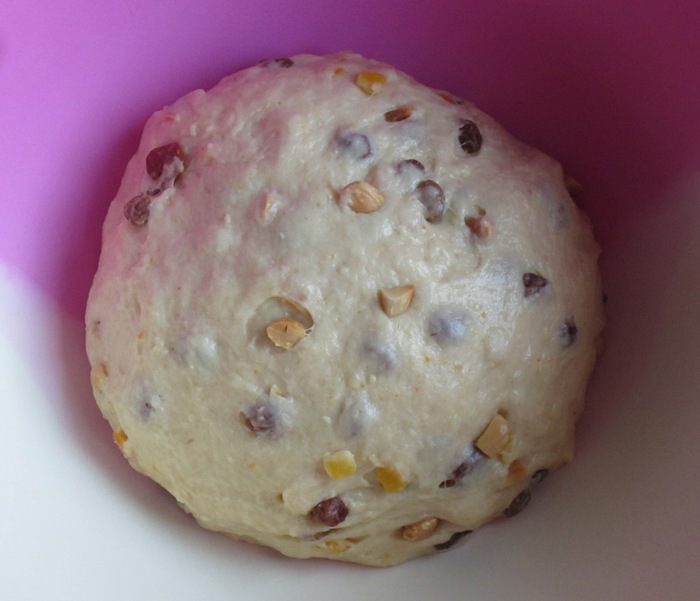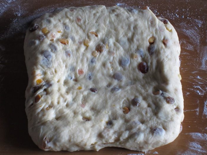 Добавить миндаль, цукаты, изюм и вымесить ещё несколько минут.