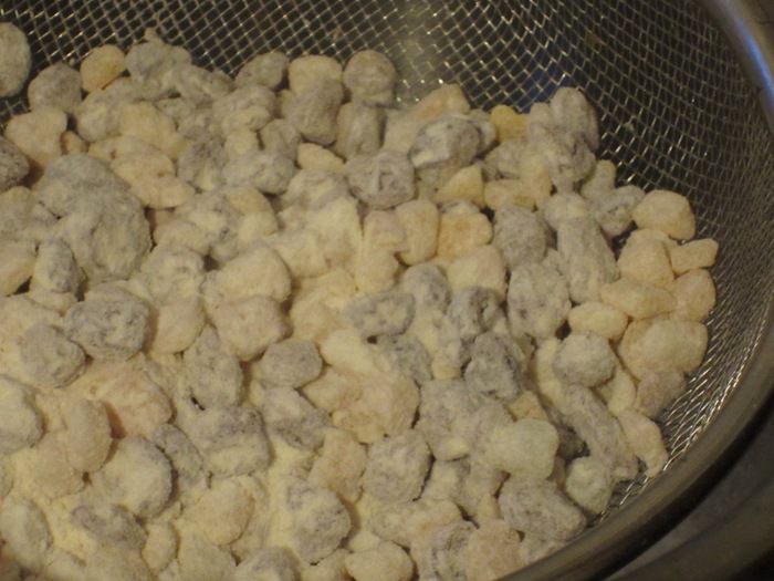 Затем обвалять в муке, положить в сито и просеять, чтобы удалить излишки муки.