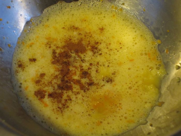 Взбить яйца с молоком, добавить кардамон, апельсиновую цедру и имбирь, перемешать.