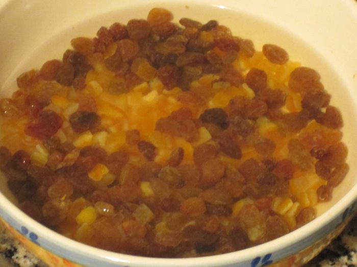 Изюм и апельсиновые цукаты залить тёплой водой с 50 мл рома на 2 часа. Откинуть на дуршлаг, выложить на бумажное полотенце.