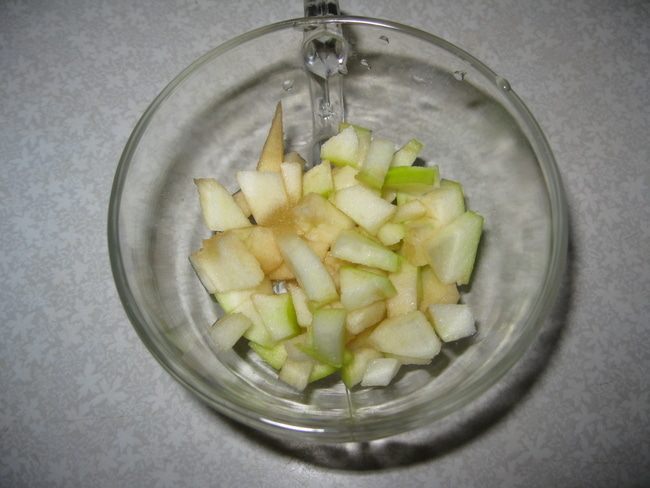 Моем все фрукты. 1-й слой: нарезаем кубиками яблоко.