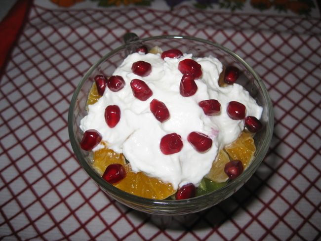 Сверху поливаем густым йогуртом без наполителя и посыпаем зернами граната. Легкий и вкусный салат готов. Приятного аппетита!