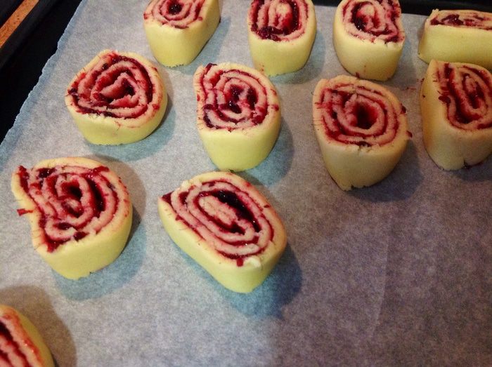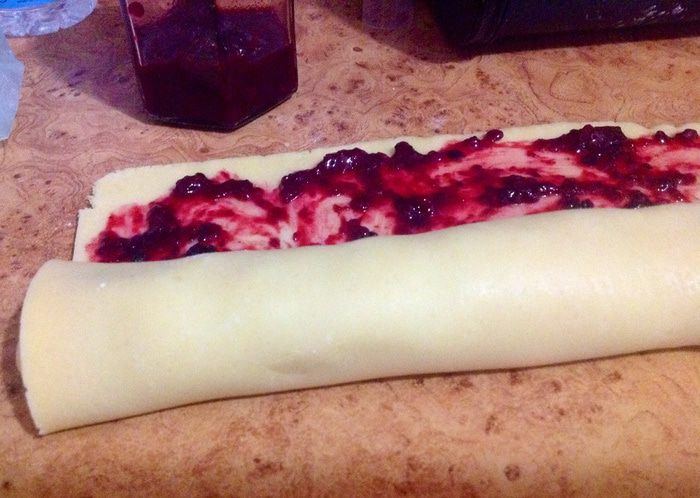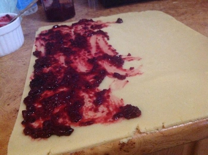 Раскатать тесто в пласт, толщиной 0.7-0.5 см. Смазать его хорошо джемом (может быть на Ваш вкус и предпочтение!).