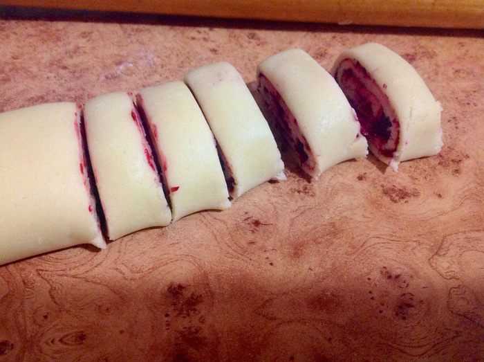 Вынуть рулетики из холодильника. Нарезать их на кружочки толщиной 1-1.5см.