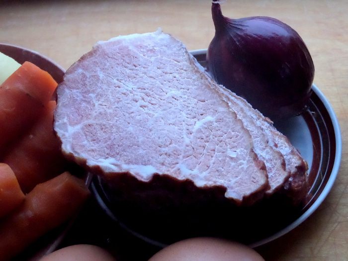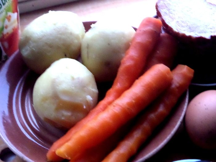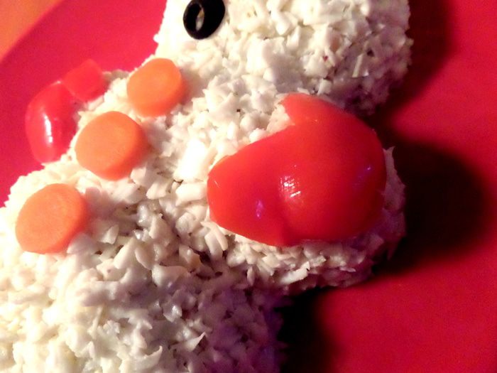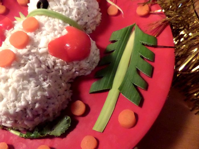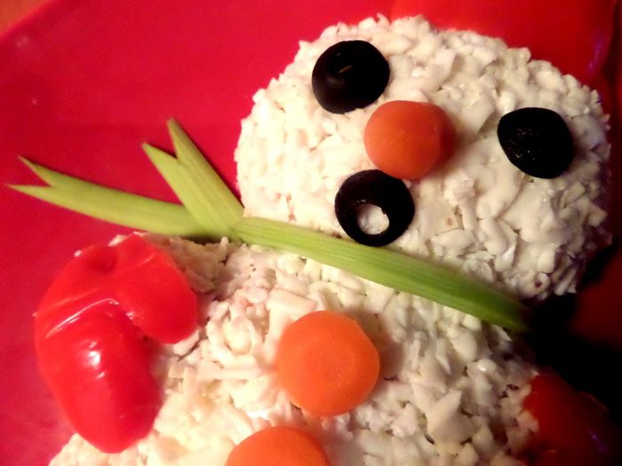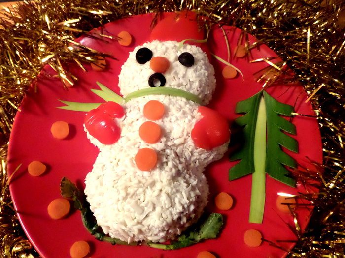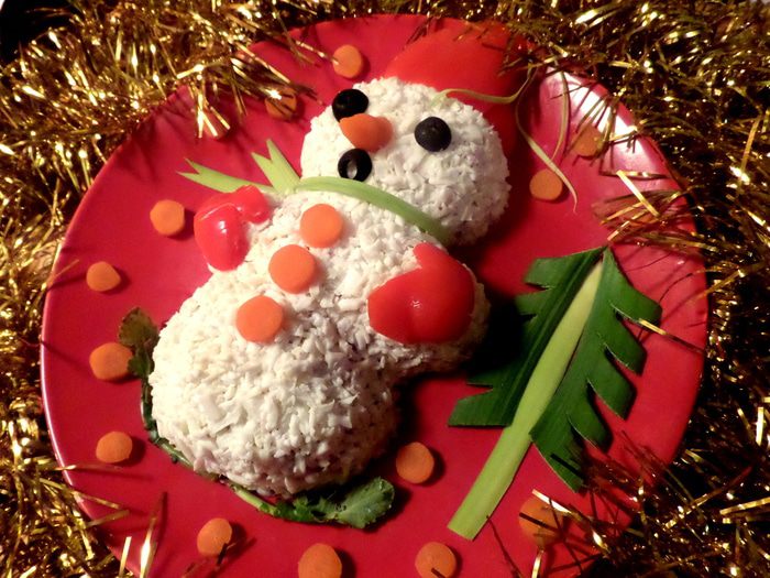 У нас совсем нет снега...,травка зеленет и даже распустилась верба!!! Сегодня последний день 6-ти дневных выходных в честь католического Рождества))) И хоть мы все православные,но решила приготовить такой праздничный салатик своим мужчинам как напоминание о снеге)))