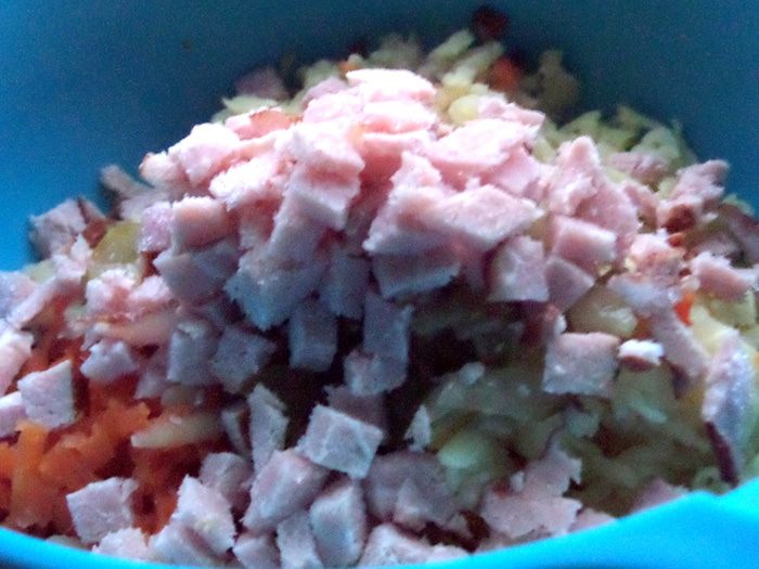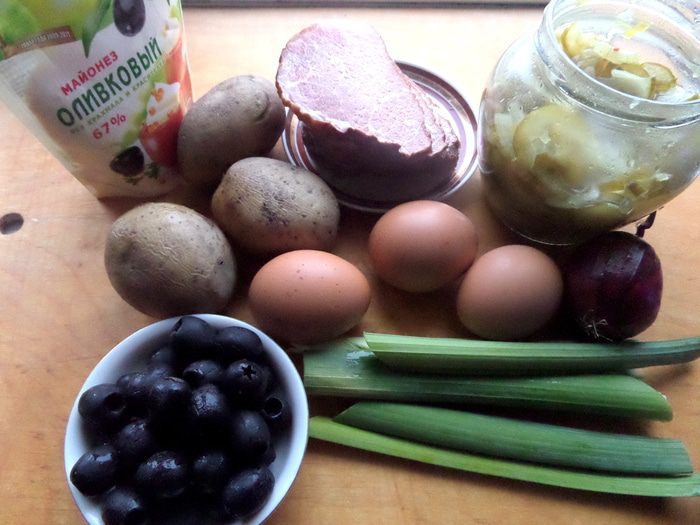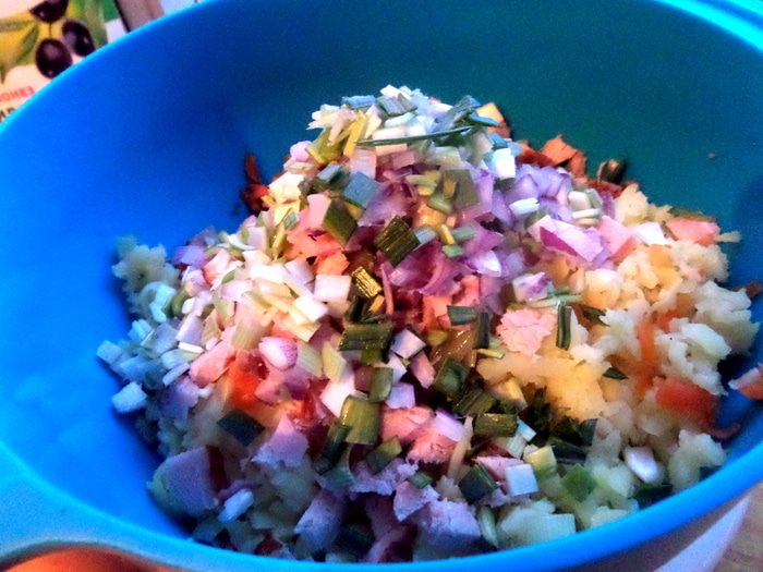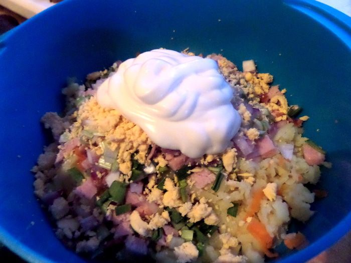 Заправить оливковым майонезом по вкусу. Перемешиваем.