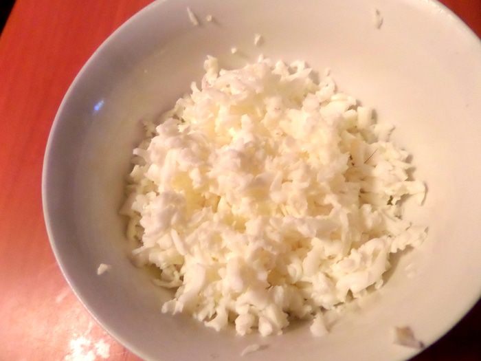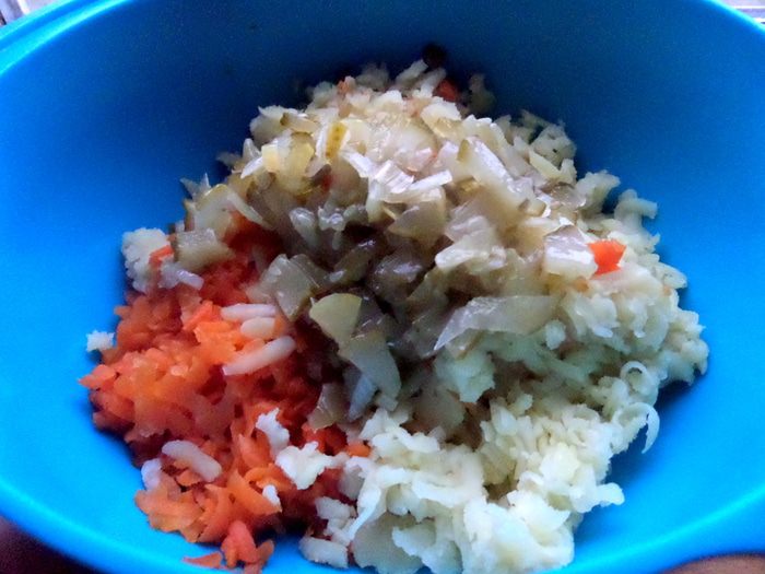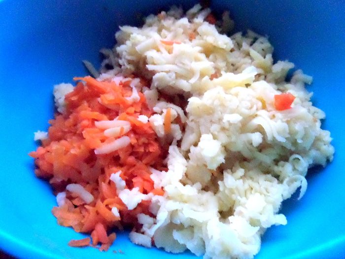 Натереть крупно...Немного моркови оставить для пуговиц!