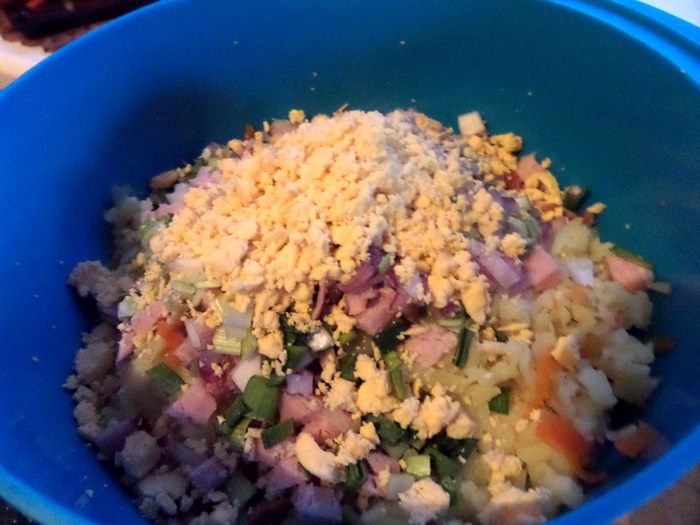 Яйца отварить заранее, отделить желтки и размять в салат.