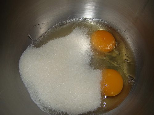Яйца взбить с сахаром, миндаль измельчить.