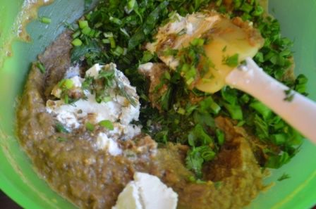 В тесто добавить нарубленный зеленый лук и 100 г феты.
