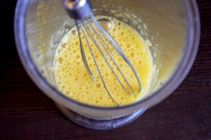 Белок взбить с яйцом, куркумой, солью и разрыхлителем.