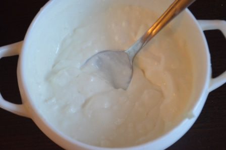 Выжимаем сок из лимона. Для соуса смешиваем оставшуюся фету, 1 соловую ложку лимонного сока, чеснок и сметану. Я брала греческий йогурт.