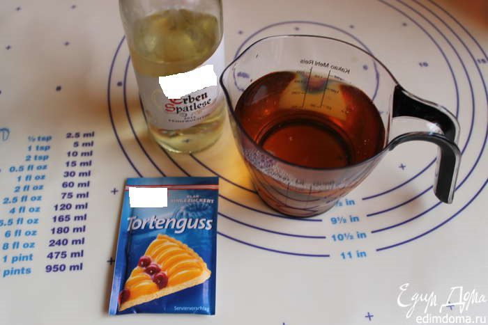 Займемся нашим желе. Берем белое полусухое вино. Пакетик сухого желе, прозрачного, рассчитанного на стакан жидкости. Итак, смешаем сок яблочный, вино (если делаете для детей, замените на сок), сахар 3 ложки. Ставим на медленный огонь и, помешивая, доводим до загустения.