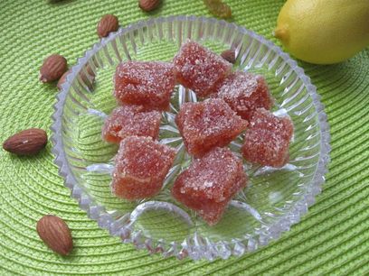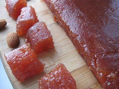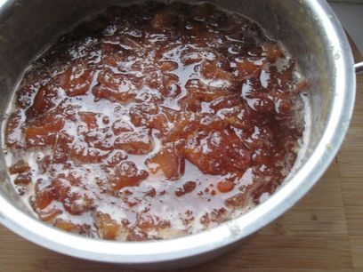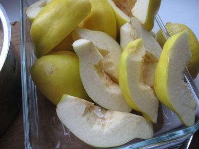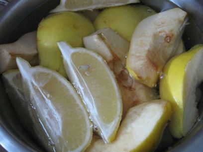 Воду слить, лимон выбросить, с айвы снять кожуру, нарезать на небольшие кусочки, засыпать сахаром, перемешать, довести до кипения и варить на медленном огне до загустения, периодически помешивая, чтобы не пригорело. Айва постепенно будет менять цвет, начиная со светлых тонов до слегка оранжево-коричневатых, а потом и более насыщенного оранжево-коричневого цвета (примерно через 1 час-1 час 20 мин.). Плотность мармелада зависит от времени варки. Я варила 1 час 20 минут.