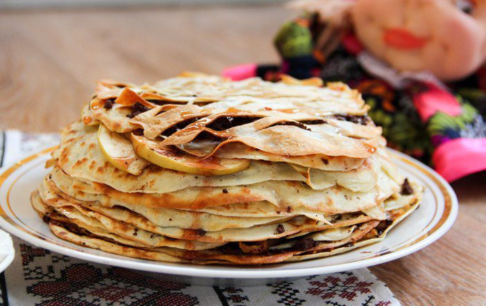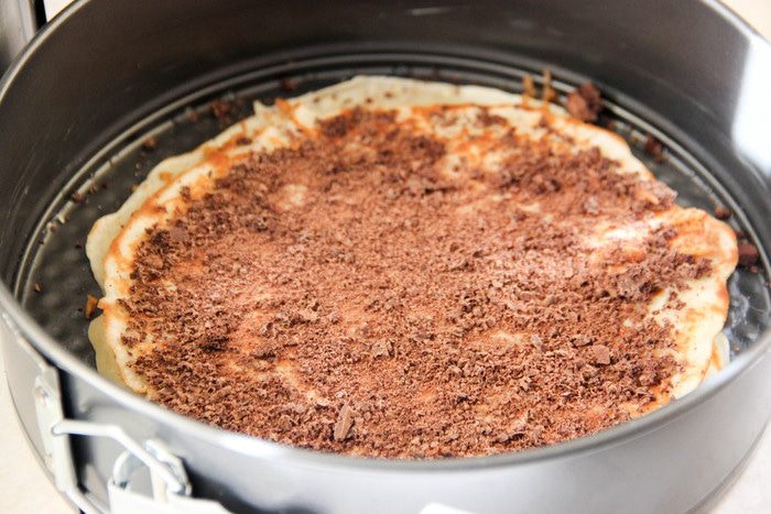 Следующий слой — блинчик, посыпанный тертым шоколадом. И так по очереди, пока блины не закончатся.