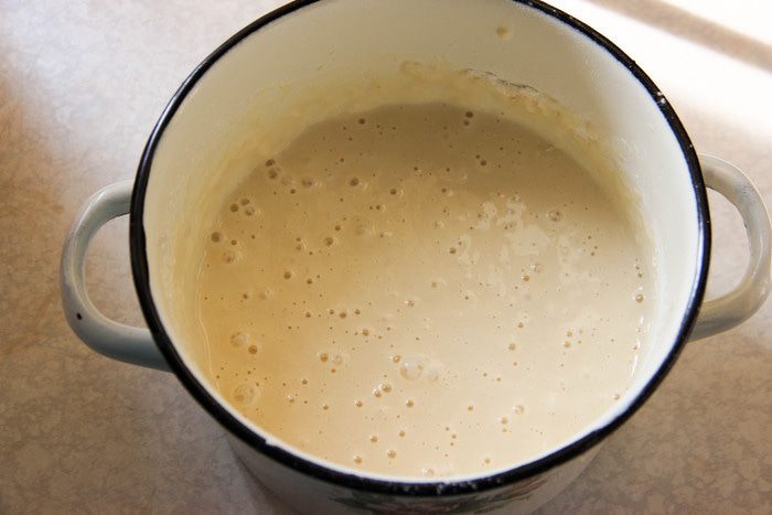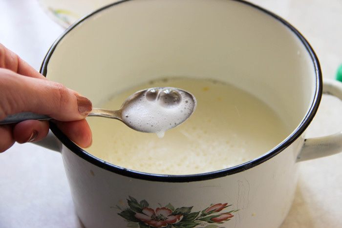 Добавляем массу в теплое молоко. Туда же — соду, гашенную уксусом.