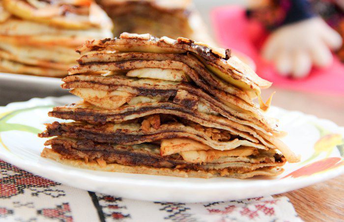 А теперь выкладываем первый блин в форму. Смазываем его сливочным маслом, сверху посыпаем натертым (или тонко нарезанным) яблоком. Добавляем сахар и корицу по вкусу.