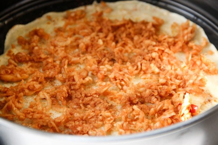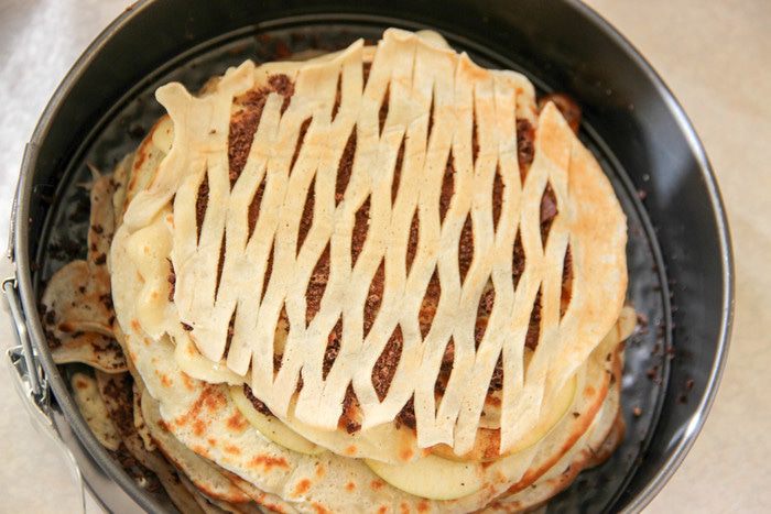 Последним слоем должен оказаться блинчик. Я сделала его ажурным. Отправляем шарлотку в духовку на 15 минут. Выпекаем при температуре 160°С.