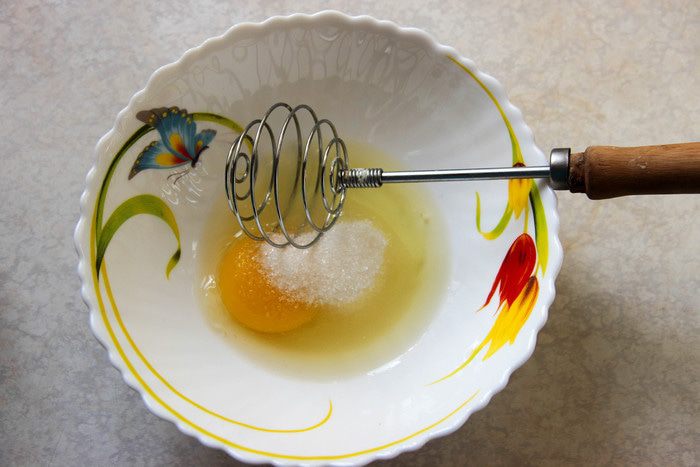 Яйцо взбиваем с сахаром венчиком.