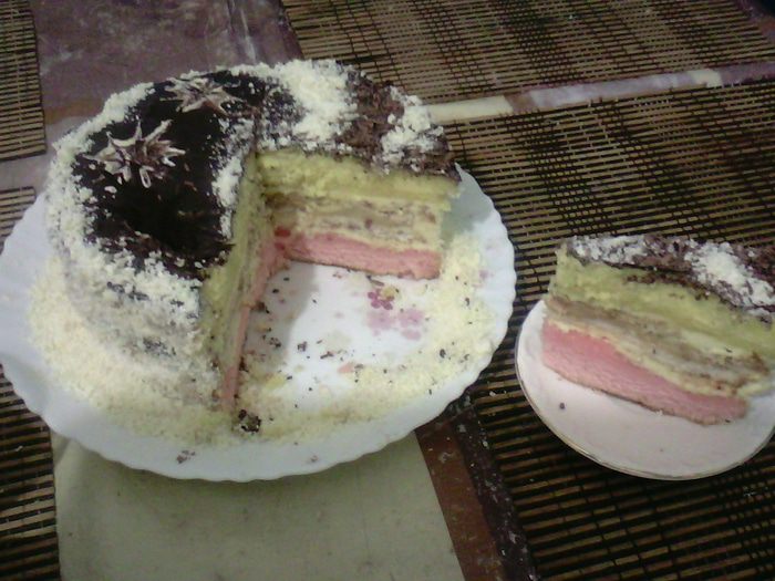 Приготовление крема:взять желтки взбить,сливки с сахаром довести до кипения и вливать постепенно в желтки при этом не прекращая взбивать венчиком,потом снова вылить в кастрюлю и на медленном огне помешивая довести до загустения,снять с огня остудить.Размягченное сливочное масло взбить с сахарной пудрой и постепенно вливать остывшую массу,взбить до однородности.