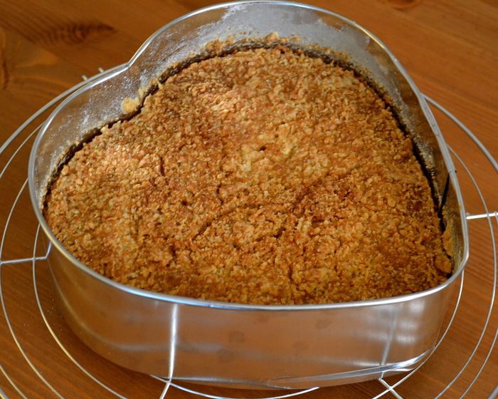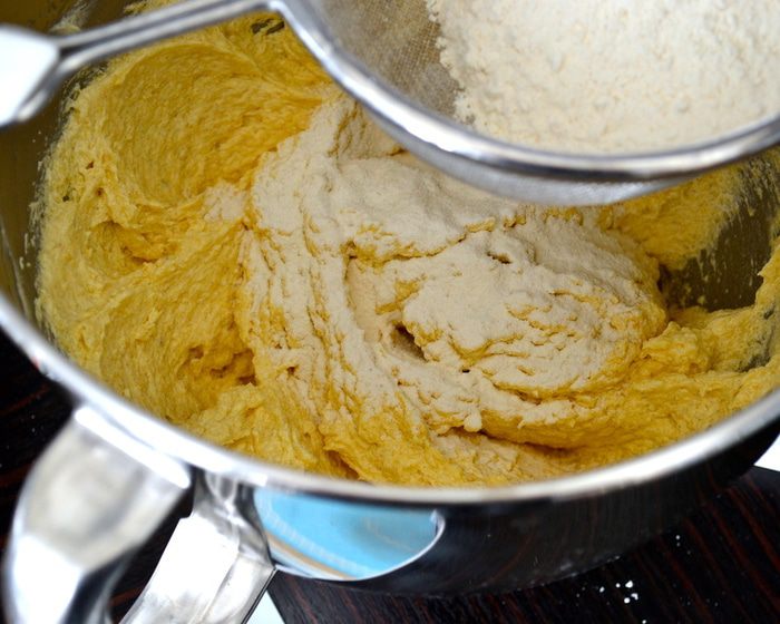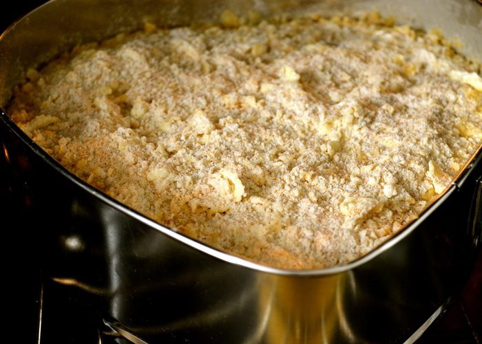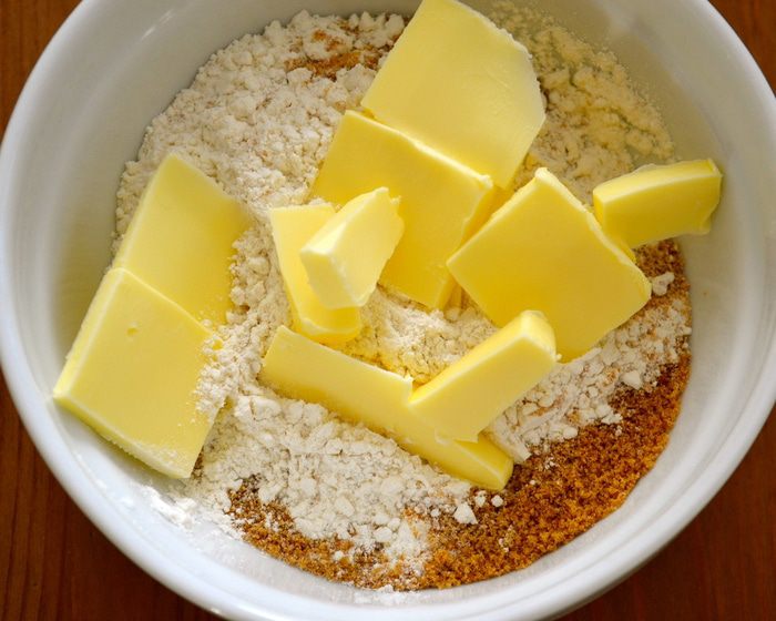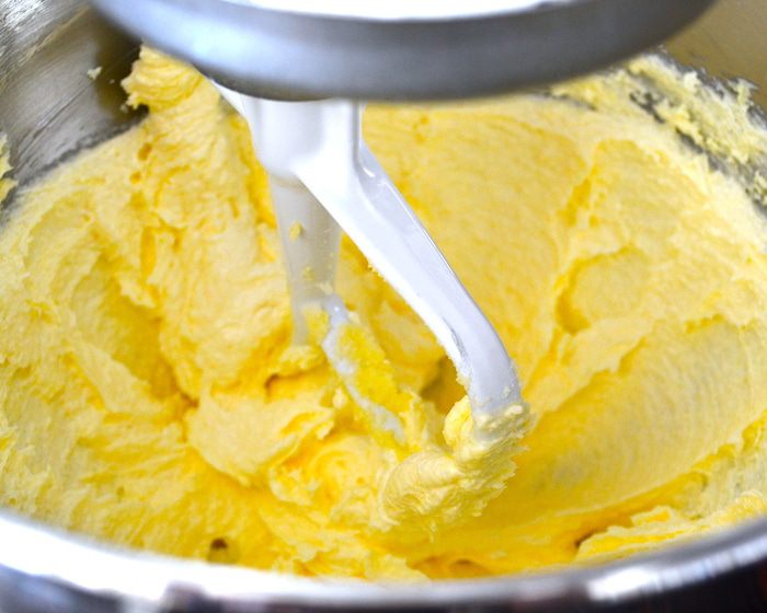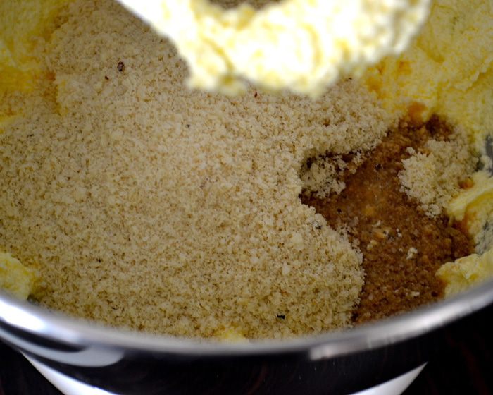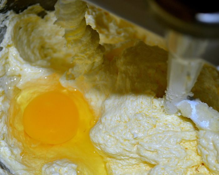 Из указанного в ингредиентах количества масла, 170 г (размягченного масла) идут в тесто, и 40 г (холодное масло, кусочками) нам понадобятся для штрейзеля. Духовку включить разогреваться на 150 С. С помощью кухонного комбайна или миксера взбить 170 г мягкого масла с сахаром до получения пышной массы.
