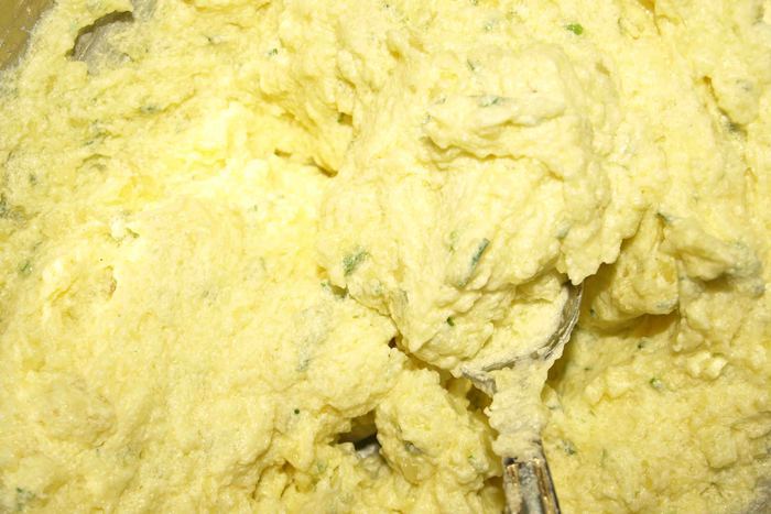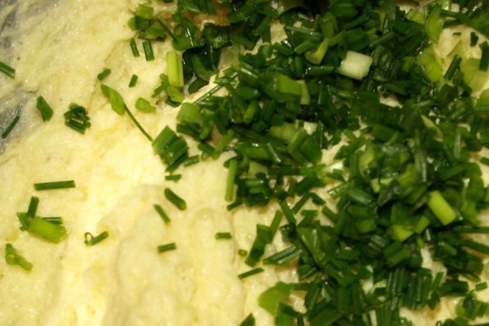 Картофельное пюре (550 г) взбиваем с размягченным маслом (100 г) в кремообразную массу. Добавляем зеленый лук.