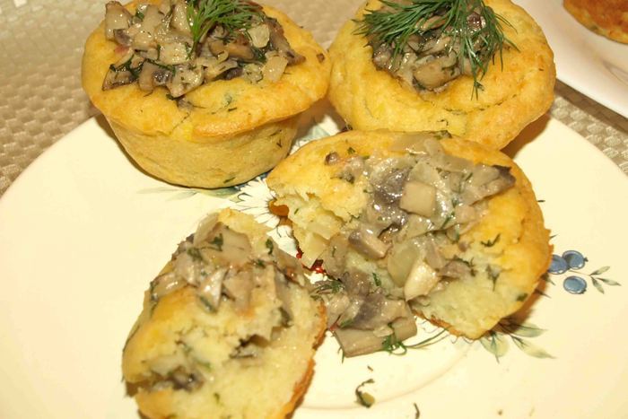 В готовых маффинах сделать небольшое углубление, добавить оставшуюся начинку. Украсить укропом. Приятного аппетита.