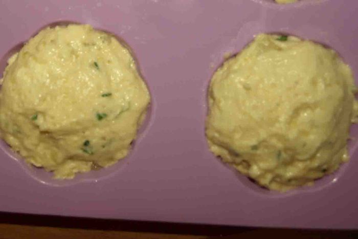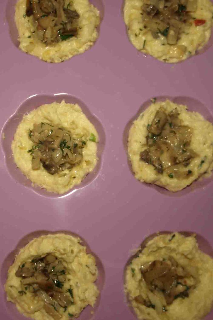 Выкладываем тесто в формочки, делаем углубление и добавляем начинку.
