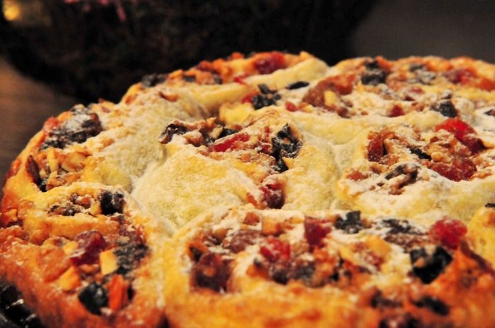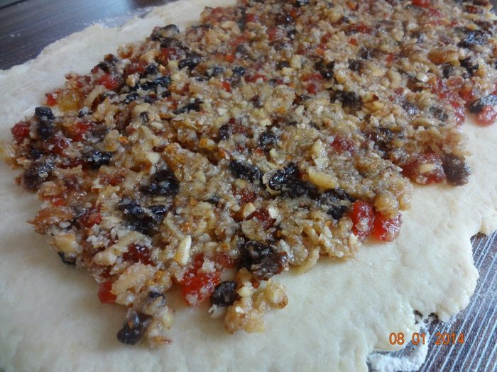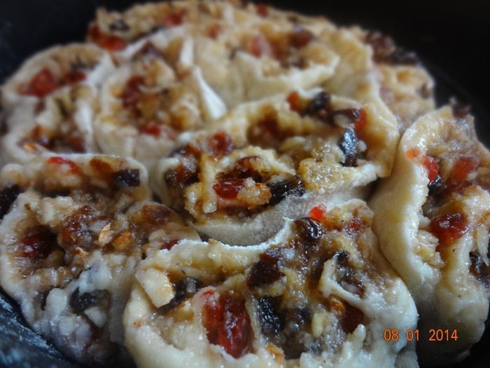 Свернуть тесто аккуратно в рулет по длинной стороне и защипать со свободного края. Перенести на бумаге на противень и убрать на холод также на час. Это для того, чтобы потом при нарезании кусочки получились ровными, я же люблю некую небрежность в домашних пирогах, поэтому разрезаю рулет сразу на кусочки 2-3 см. шириной и укладываю их в подходящую форму (смазанную маслом) плотно друг к другу и убираю на холод на 30-40 минут.