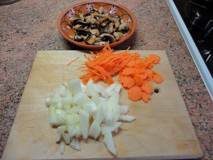 Лук и грибы нарезать кубиками, морковь нашинковать или нарезать цветочками.