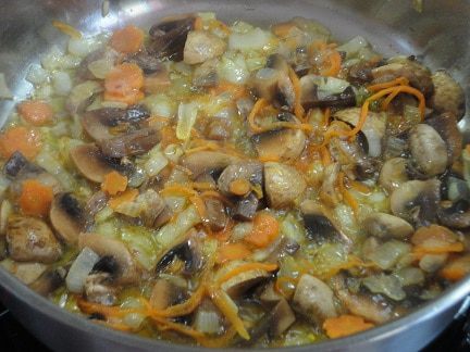 Морковь и лук обжарить в масле. Когда пассеровка зарумянится, добавить грибы, специи, быстро обжарить.