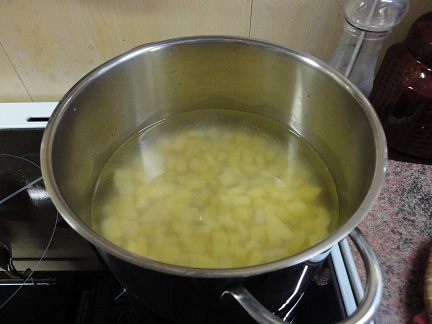 Очищенный и нарезанный кубиками картофель залить холодной водой и поставить вариться до готовности, минут 15.