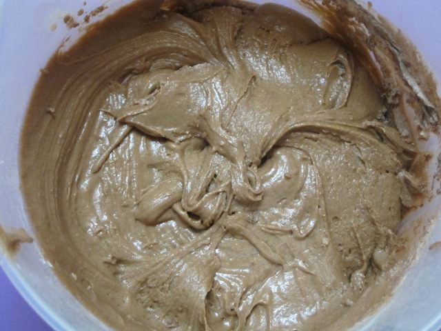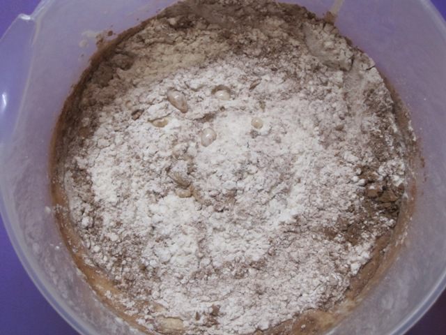 Добавить просеянную муку, 2 столовые ложки какао и разрыхлитель.