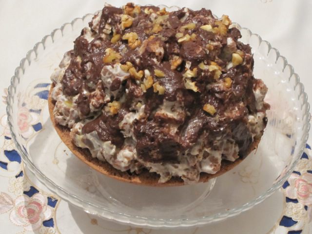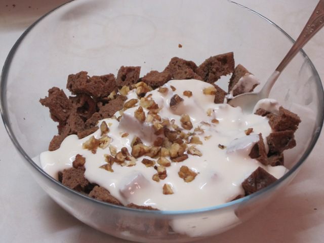 К кубикам коржа добавить крем из сметаны и орехи. Аккуратно перемешать.