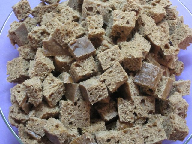 Верхнюю часть коржа нарезать кубиками.