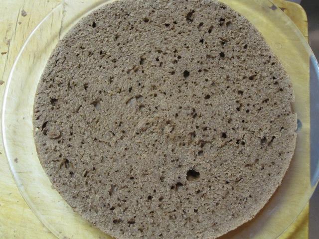 Вынуть испеченный корж. Разрезать на 2 части - нижняя часть будет тонкой.