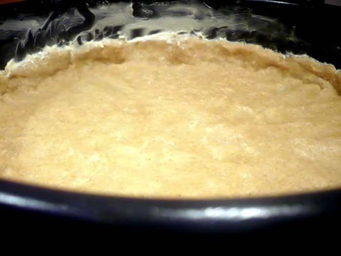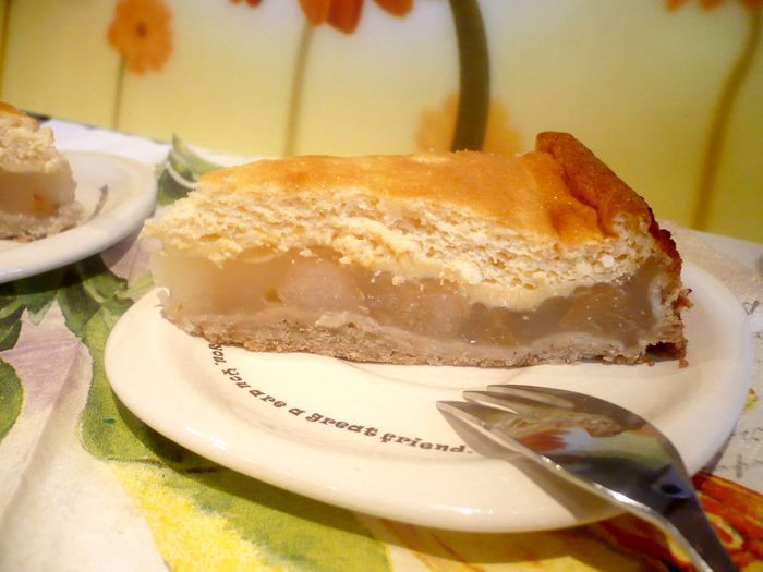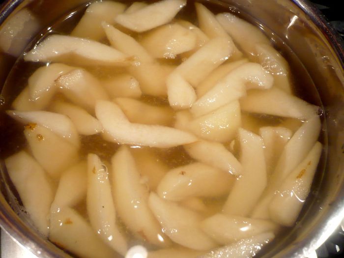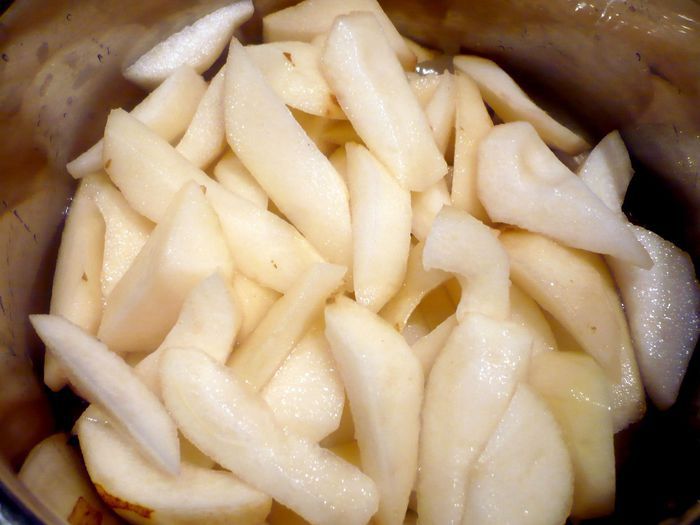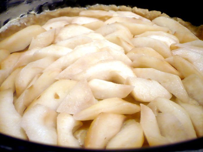 Приготовим тесто. Смешаем 30 г сахара, 1 яйцо, ванилин, соль и муку с натертым на терке холодным маслом до состояния крошки. Добавим 1 — 2 ст.л. холодной воды и слепим из теста шар, завернем его в пленку и уберем в холодильник на полчаса. Груши очистим от кожуры, разрежем на четвертинки, вырежем сердцевину и разрежем четвертинки еще раз вдоль. Из лимона выжмем сок и зальем наши груши.