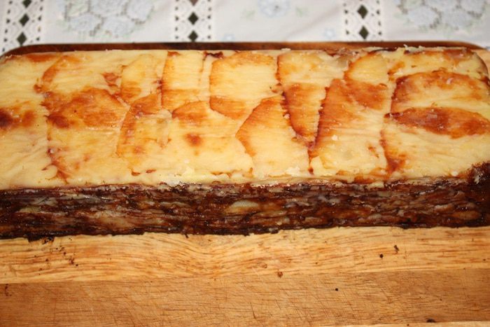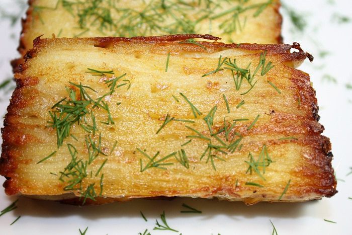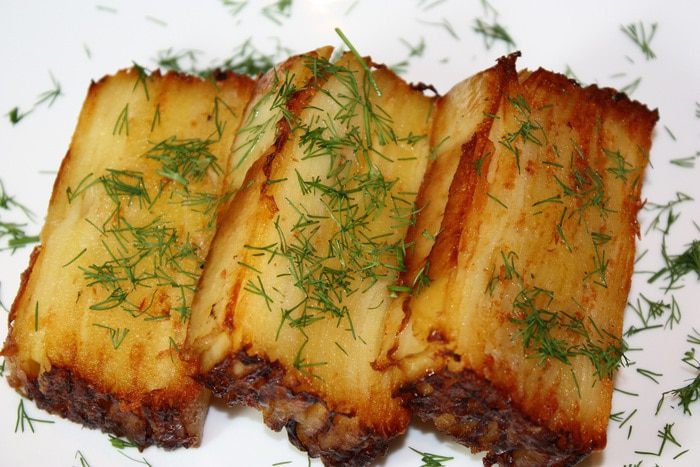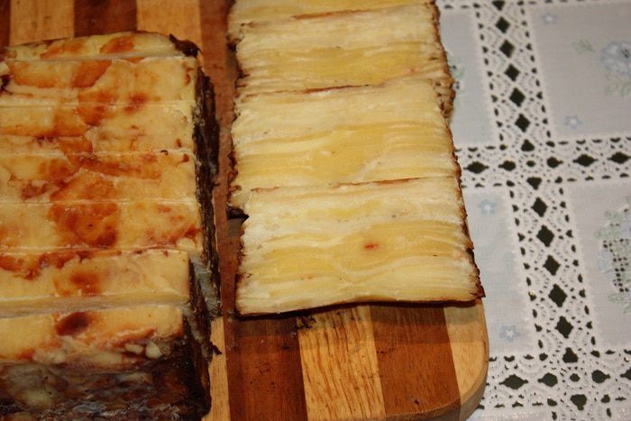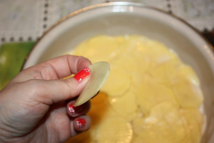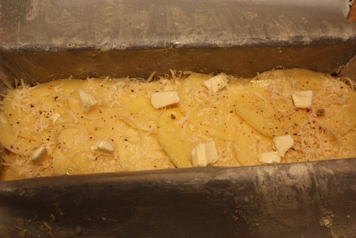Форму выкладываем бумагой для выпекания, промазанной сливочным маслом. Затем выкладываем картофель внахлест. Каждый слой посыпаем приправой для картофеля и тертым сыром и кладем кусочки сливочного масла. Солить через слой. Когда доходим до среднего слоя, выдавливаем чеснок через чеснокодавку, затем сыр и масло. Когда все слои выложены, залить 100 мл сливок.