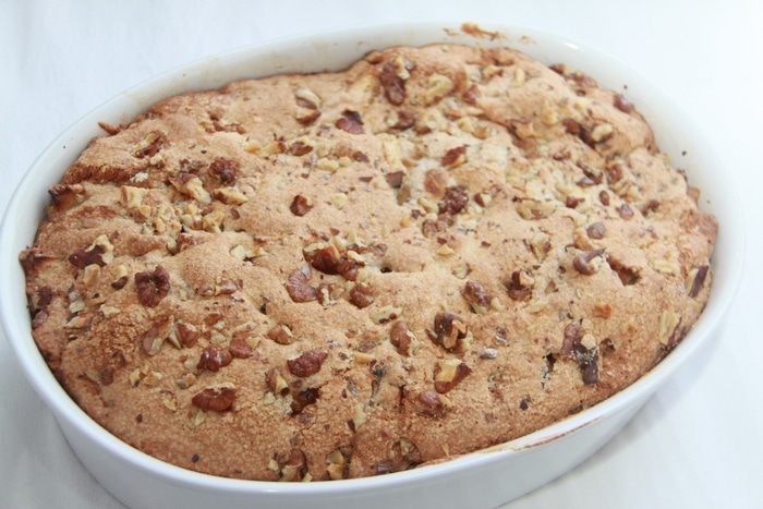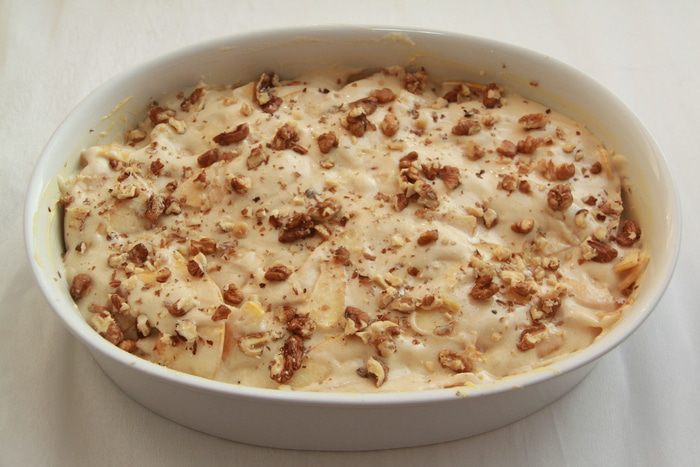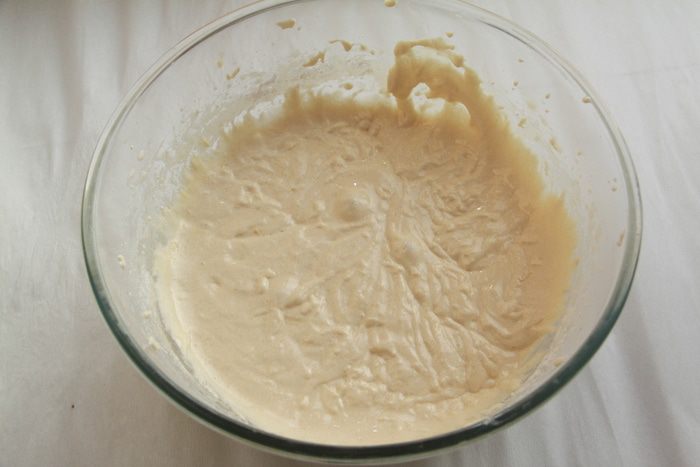 Замесить обычное тесто для шарлотки: яйца взбить с сахаром, добавить просеянную муку. Отдельно (!) друг от друга добавить в тесто соду и уксус. В одной старой книге прочитала, что гашение соды перед вводом в тесто не имеет смысла, потому что важно, чтобы химическая реакция, в результате которой выделяется углекислый газ, произошла в тесте, а не в ложке! Также добавить ванильную эссенцию (или ароматный алкоголь).