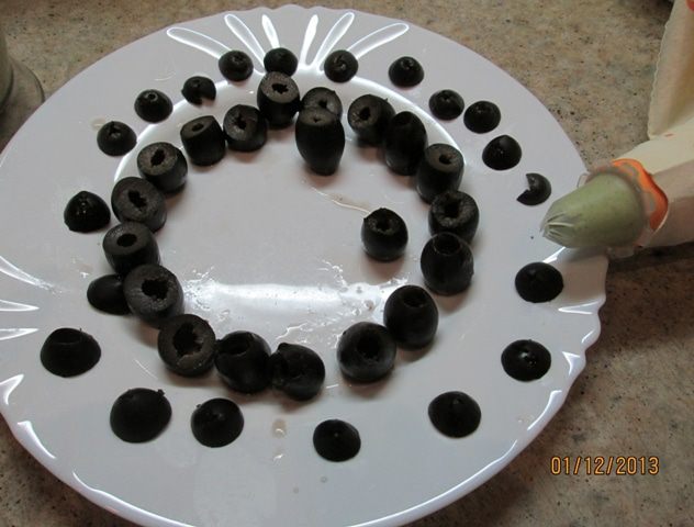 Маслины я купила без косточки. Срезать шляпку у маслины, поставить срезом на тарелку. Крышечку сохранить. Кулинарный мешок начинить муссом из тунца.