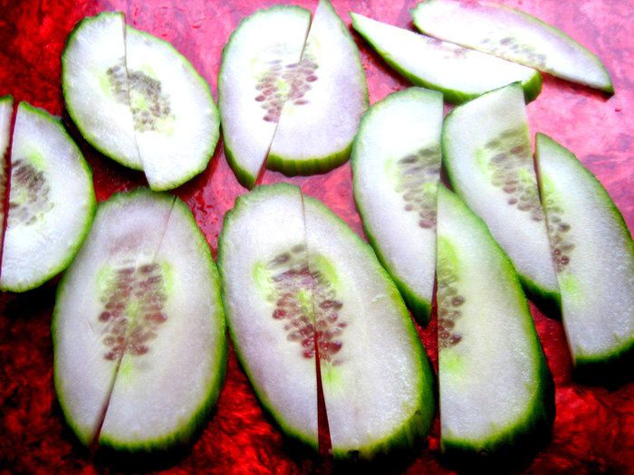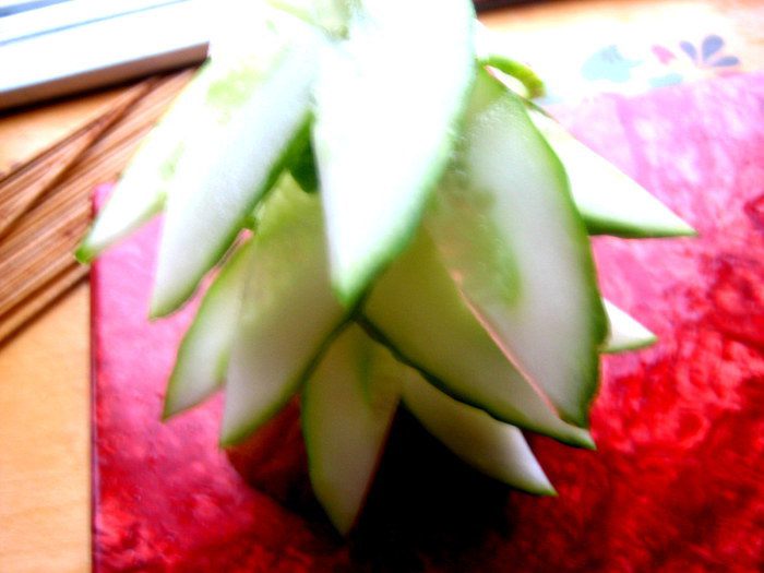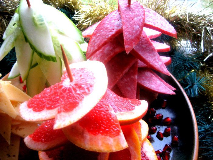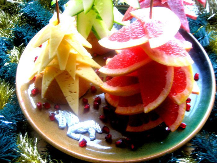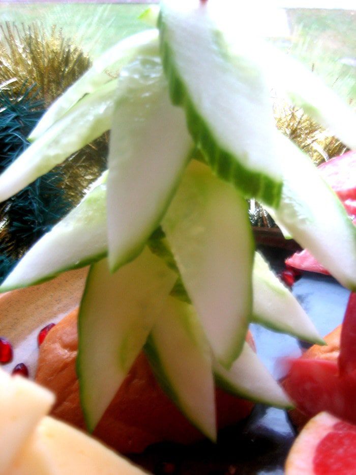 Ёлочка из огурца особенно приближена к оригиналу))) Свежий огурец разрезать наискосок.