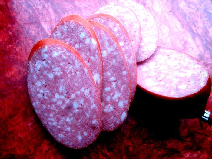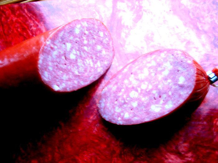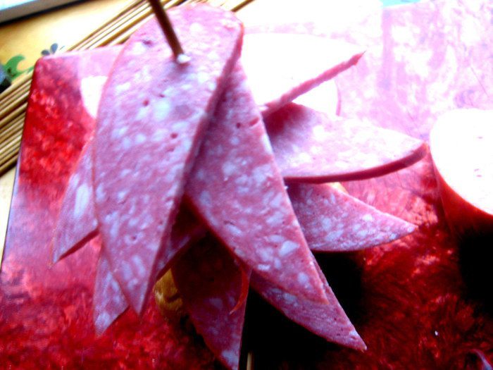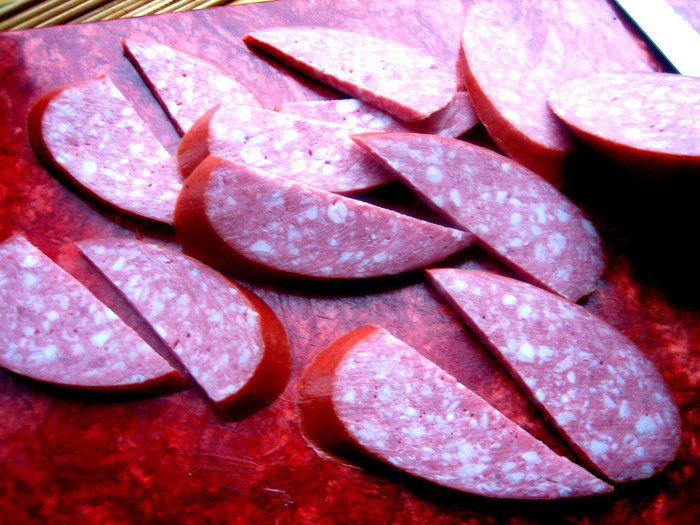 И напоследок вредненькая закуска))) Разрезаем вдоль наискосок копчёную колбаску... Ну куда ж без неё в праздники?)))