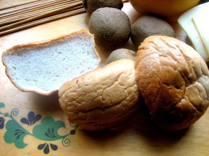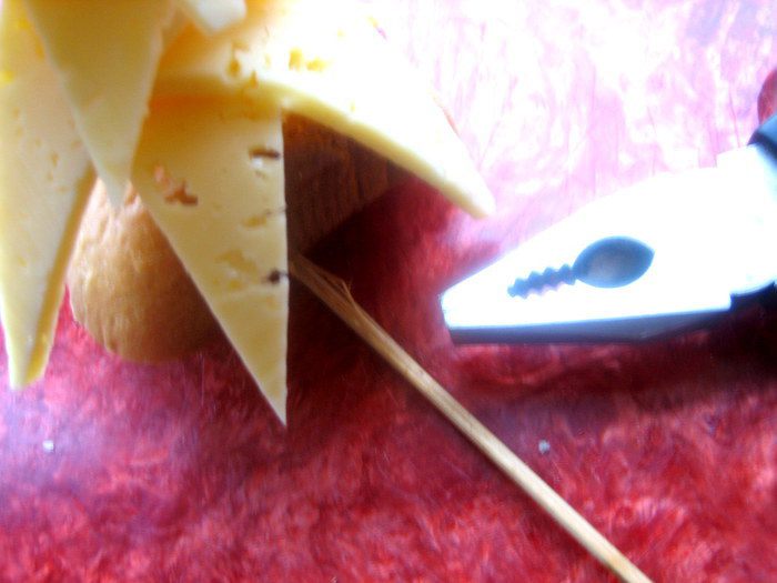 Втыкаем шпажку в горбушку и начинаем нанизывать сыр.