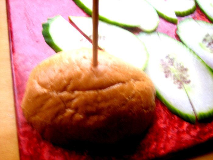 Снова шпажку втыкаем в горбушку и нанизываем ломтики огурца в виде веток.