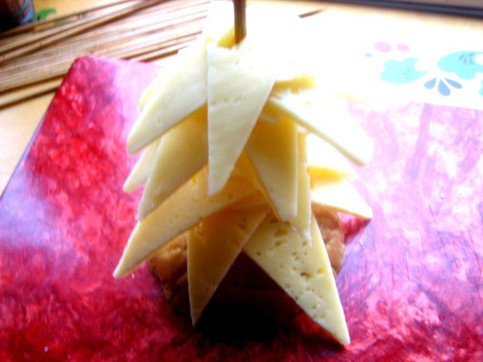 С какой начнём ёлочки? С сырной... Сыр нарезать тонкими пластинами или купить уже нарезанный.