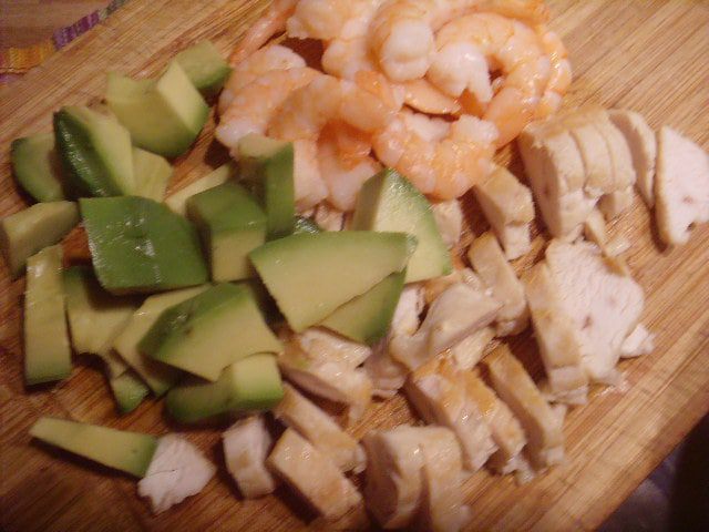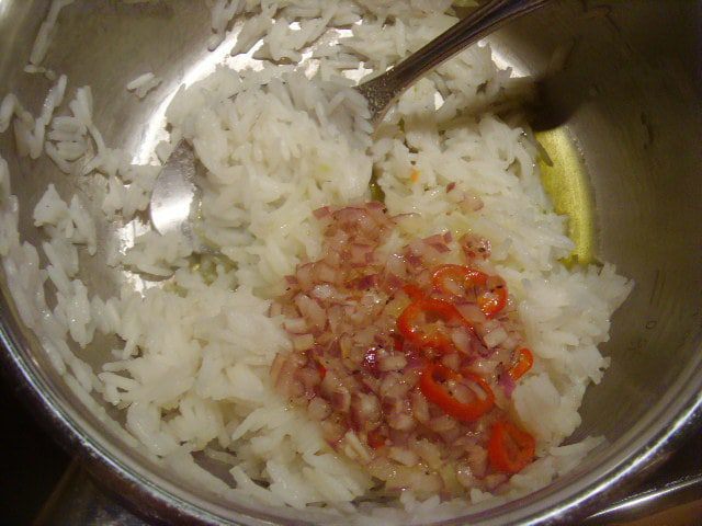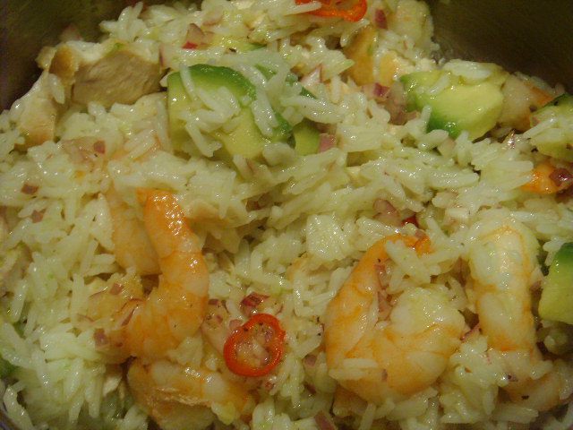 Поставим варить рис. В это время займёмся заправкой: смешаем лимонный сок с сахаром, солью и перцем. Тонкой струйкой добавим оливковое масло, при интенсивном помешивании доведём соус до эмульсионного состояния. Добавим мелко нарубленный чеснок, лук и пеперони. В ещё тёплый рис введём нашу заправку, перемешаем.