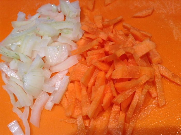 Нарезать картошку, морковь, лук, перец, цветную капусту.
