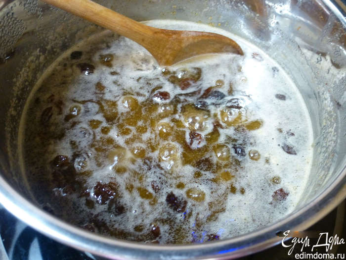 В кастрюлю наливаем молоко, добавляем сахар, сливочное масло, изюм, соль и специи (корицу, имбирь, мускатный орех, красный острый перец).