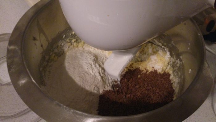 Добавить 60 г шоколада и 200 г просеянной муки.